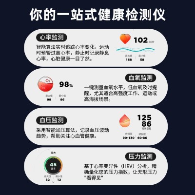 通讯类型蓝牙功能防水,拍照,计步,心率监测,血压测量,蓝牙通话,智能提醒,遥控自拍,睡眠监测,血氧检测,信息推送,运动追踪
